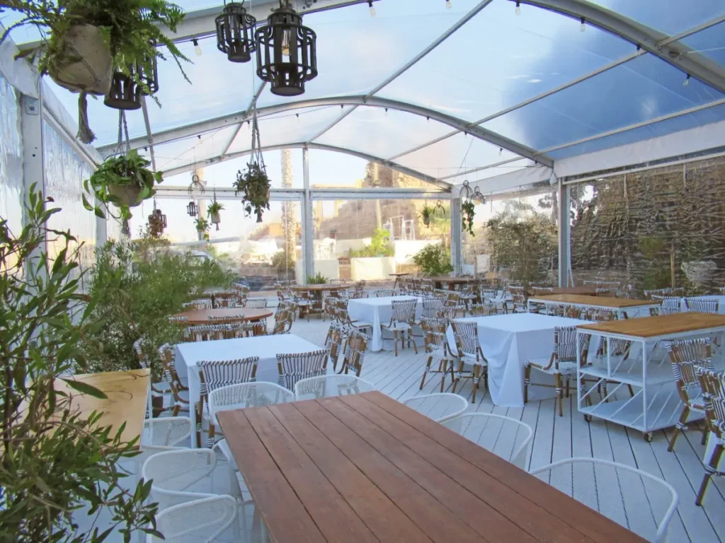 סגירת חורף עונתית לאולם האירועים היוקרתי. האוהל מחופה גג PVC שקוף וקירות שקופים נגללים. כולל חיבור שקוף למבנה האולם ומרזבים דקורטיביים.